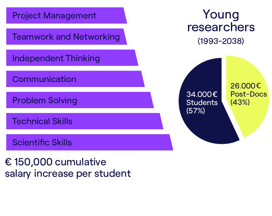CERN’deki Büyük Hadron Çarpıştırıcısı (LHC) araştırma programı, 1993 ile 2038 yılları arasında toplum için yaklaşık 3,3 milyar € net bugünkü değer (yatırım ve işletme maliyetleri düşüldükten sonra) üretmektedir.
